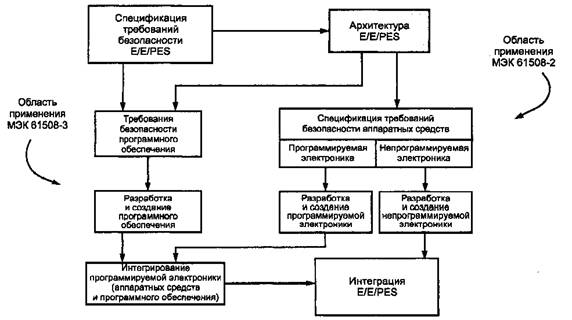 Дата введения - 2008-09-01 1. Область применения1.1. Настоящий стандарт: a) применяют только совместно с МЭК 61508-1, описывающим общий подход для достижения функциональной безопасности; b) применяется (как определено в МЭК 61508-1) к любой системе, связанной с безопасностью, которая содержит хотя бы один электрический, электронный или программируемый электронный компонент; c) применяется ко всем подсистемам и их компонентам внутри Е/Е/РЕ систем, связанных с безопасностью (включая сенсоры, исполнительные устройства и интерфейс человек-машина); d) определяет способ использования информации, полученной в соответствии с МЭК 61508-1, описывающей полные требования к безопасности и их распределение по Е/Е/РЕ системам, связанным с безопасностью, а также определяет, как полные требования к безопасности преобразуются в требования к функциям безопасности E/E/PES и в требования к полноте безопасности E/E/PES; e) устанавливает требования к действиям, которые должны быть реализованы на стадиях разработки и изготовления Е/Е/РЕ систем, связанных с безопасностью (то есть формирует модель жизненного цикла безопасности E/E/PES), за исключением требований к программному обеспечению, которые рассмотрены в МЭК 61508-3 (см. рисунки 2 и 3): эти требования включают в себя указания по применению ранжированных по уровням полноты безопасности методов и средств для предотвращения ошибок и отказов и для управления ошибками и отказами; f) определяет информацию, необходимую для установки, ввода в эксплуатацию и заключительного подтверждения соответствия безопасности Е/Е/РЕ систем, связанных с безопасностью; g) не определяет стадии эксплуатации и технического обслуживания (см. МЭК 61508-1), но содержит требования для подготовки информации и процедур, необходимых пользователям для эксплуатации и технического обслуживания Е/Е/РЕ систем, связанных с безопасностью; h) определяет требования, предъявляемые к организациям, осуществляющим модификацию Е/Е/РЕ систем, связанных с безопасностью. Примечания 1. Настоящий стандарт главным образом предназначен для поставщиков и/или технических департаментов внутри компаний, отвечающих за формирование и реализацию требований по модификации Е/Е/РЕ систем, связанных с безопасностью. 2. Взаимосвязь между настоящим стандартом и МЭК 61508-3 показана на рисунке 3. 1.2. МЭК 61508-1 - МЭК 61508-4 являются основополагающими стандартами по безопасности, хотя это не применяется в контексте Е/Е/РЕ систем, связанных безопасностью, имеющих небольшую сложность (см. МЭК 61508-4, пункт 3.4.4). В качестве основополагающих стандартов по безопасности данные стандарты предназначены для использования техническими комитетами при подготовке стандартов в соответствии с Руководствами МЭК 104:1997 и ИСО/МЭК Руководство 51:1999. Стандарты серии МЭК 61508 предназначены также для использования в качестве самостоятельных стандартов.