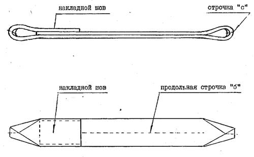 Рис. 2. Общий вид пояса МСП ЛИСТ 11, раздел 2 "Правила приемки и методы испытаний" дополнить: 2.21. Пояса МСП должны быть приняты отделом технического контроля предприятия-изготовителя в соответствии с требованиями настоящих ТУ. 2.22. Приемка производится партиями. В состав партии входят изделия одной марки, изготовленные из материала одного вида и качества. Размер партии устанавливается не более 120 штук поясов МСП. 2.23. При приемке контролируется: внешний вид и конструкция изделия, размеры, конструкция швов, количество и качество проложенных строчек на накладном шве, размеры накладного шва, наличие строчек "а", "б", "с", марка текстильного материала, использованные швейные нитки, прочность накладного шва, 2.24. В поясе МСП не допускается: обрыв нитей основы и утка, порез материала, несвязанные и неоплавленные концы швейных ниток. 2.25. Размеры изделий определяют с точностью до 2.26. Потребитель имеет право производить контрольную выборочную проверку соответствия поясов МСП требованиям настоящих условий, применяя для этой цели указанный ниже порядок отбора образцов. 2.27. Для контрольной проверки размеров, внешнего вида, качества швов, количества строчек и конструкции поясов МСП отбирают от каждой партии образцы изделии в количестве 3-х штук. Отобранные образцы подвергают штучному осмотру и обмеру, 2.28. Если при проверке отобранных образцов окажется хотя бы один образец, не соответствующие требованиям настоящих ТУ, то следует произвести повторную проверку удвоенного числа образцов. Если при повторной проверке окажется хотя бы один образец, не соответствующий требованиям настоящих ТУ, то партия изделий приемке не подлежит. Потребитель имеет право в этом случае производить приемку поштучно. Кроме того, при поступлений новой партии тканей и ниток предприятие-изготовитель поясов МСП проводит испытания поступившего сырья по ГОСТ 3813-72. Раздел 3 "Маркировка" дополнить: 3.6. Маркировку пояса МСП производят нанесением или закреплением долговечного клейма или ярлыка. 3.7. Маркировка должна быть ясной, прямоугольной формы, размером не более 75×80 мм. и содержать наименование предприятия-изготовителя и номер контролера отдела технического контроля. 3.8. Маркировку пояса производят у накладного шва. Раздел 4 "Хранение и транспортировка" дополнить: 4.7. Упаковку пояса производят следующим образом: пояс в расправленном виде укладывают на