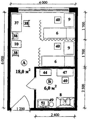 2. ВСПОМОГАТЕЛЬНЫЕ ОТДЕЛЕНИЯ2.1. Больничные аптеки2.1.1. Основной задачей больничных аптек является обеспечение лечебно-профилактического учреждения медикаментами, перевязочными материалами, предметами ухода за больными и другими изделиями медицинского назначения. Аптека не производит отпуска лекарств и других товаров населению. Также аптека может быть базой для проведения научных исследований и производственной практики учащихся фармацевтических училищ и студентов фармацевтических институтов (факультетов). 2.1.2. Больничную аптеку целесообразно размещать в отдельно стоящем здании, а при размещении аптеки в больничных корпусах - располагать ее в лечебно-диагностическом блоке главного корпуса. Аптека должна иметь самостоятельные наружные вход и выход и отделяться от помещений иного назначения стенами из несгораемых материалов. 2.1.3. Для аптеки необходимо предусмотреть погрузочно-разгрузочную площадку для подъезда машин (рампа с навесом), распложенную вблизи распаковочной. Высота площадки должна соответствовать уровню днища кузова грузового автомобиля, ширина - около 2-х метров. 2.1.4. Помещения хранения ядовитых и сильнодействующих лекарств, включенных в списки Постоянного комитета по контролю наркотиков (ПККН), а также наркотических лекарственных средств и психотропных веществ, должны быть оборудованы в соответствии с Приказом МЗ РФ № 330 от 12.11.1997 г. 2.1.5. В соответствии с ходом технологического процесса рецептурную следует располагать смежно с комнатой обслуживания. Комнату обслуживания необходимо приблизить к экспедиционной. Количество секций в передаточном шкафу для хранения скомплектованных заказов в комнате обслуживания должно соответствовать числу функциональных подразделений лечебного учреждения. 2.1.6. Ассистентскую необходимо приблизить к аналитической, моечной, дефектарской и помещению хранения чистой посуды. В непосредственной близости к ассистентской желательно расположить кокторий. 2.1.7. Между помещениями асептического блока, в соответствии со стадиями технологического процесса, должна быть обеспечена последовательная непосредственная связь: моечная асептического блока → стерилизационная посуды → ассистентская-асептическая (для изготовления инъекционных и лекарственных форм) → ассистентская-асептическая (для изготовления глазных капель и лекарственных форм для новорожденных) → дефектарская → фасовочная со шлюзом → закаточная → стерилизационная лекарственных форм → контрольно-маркировочная. 2.1.8. Помещения ассистентской-асептической, фасовочной, закаточной, стерилизационной лекарственных форм и контрольно-маркировочной могут быть связаны последовательно друг с другом передаточными окнами или через дверь. Закаточная должна непосредственно примыкать к фасовочной и иметь передаточное устройство, обеспечивающее асептические условия. 2.1.9. Примерная габаритная схема ассистентской-асептической больничной аптеки приведена в Приложении 3. 2.1.10. Состав и площади помещений больничных аптек определяются заданием на проектирование. 2.1.11. Рекомендуемый набор и минимальная площадь помещений больничных аптек приведена в Таблице 2.1.1. 2.1.12. Рекомендуемый набор и минимальная площадь помещений аптек психиатрических и наркологических больниц приведена в Таблице 2.1.2. Таблица 2.1.1. Рекомендуемый