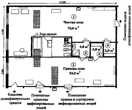 2.3. Дезинфекционные отделения2.3.1. Дезинфекционное отделение - комплекс взаимосвязанных помещений с определенным оборудованием, где осуществляется: - камерная дезинфекция одежды больных и мягкого инвентаря (матрасы, одеяла, подушки и др.); - приготовление дезинфекционных растворов для профилактической и текущей дезинфекции; - дезинфекция транспорта, используемого для перевозки больных или предметов, подлежащих обеззараживанию; - организация и осуществление профилактических дезинфекционных работ (дезинфекция, дезинсекция, дератизация). 2.3.2. Дезинфекционное отделение, осуществляющее указанную работу, является обязательным структурным элементом больницы независимо от наличия прачечной в больнице. 2.3.3. Все помещения дезинфекционного отделения должны быть разделены на две зоны - «грязную», где ведутся работы с инфицированными вещами, и «чистую», где работают с дезинфицированными вещами, и иметь два самостоятельных входа - один для приема инфицированных вещей, другой - для выдачи обеззараженных вещей. 2.3.4. Дезинфекционное отделение по своему функциональному назначению относится к группе вспомогательных служб, для которых отведена хозяйственная зона территории больницы. В этой зоне отделение может размещаться либо в отдельно стоящем здании, либо совместно с другими вспомогательными службами (прачечной, гаражом, котельной, пищеблоком) в хозяйственном корпусе на 1 этаже. 2.3.5. В акушерских корпусах допускается размещать дезинфекционные отделения в цокольном этаже, пол которого расположен ниже планировочной отметки тротуара или отмостки не более чем на 1,2 м обслуживаемого лечебно-профилактического учреждения. 2.3.6. Примерная габаритная схема основных производственных помещений дезинфекционных отделений приведена в Приложении 5. 2.3.7. Состав и площади помещений дезинфекционного отделения определяется заданием на проектирование. 2.3.8. Рекомендуемый набор и минимальная площадь помещений дезинфекционных отделений приведена в Таблице 2.3.1. Таблица 2.3.1.