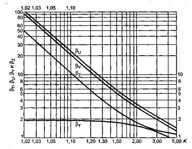 Коэффициенты βТ, βU, βY и βZ зависящие от соотношения размеров тарелки фланца, определяют по графикам, приведенным на рисунке К.1, в зависимости от К или вычисляют по формулам