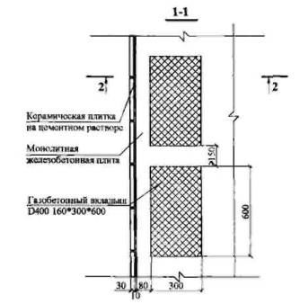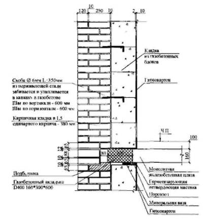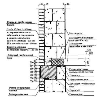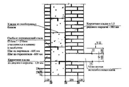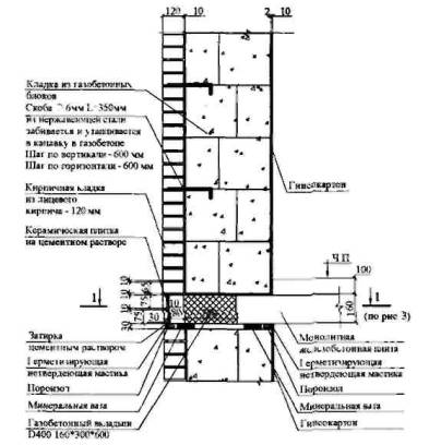 перекрытиях 6.4. Конструкции наружных многослойных стен с применением ячеистобетонных блоков, кирпича и монолитного бетона6.4.1. Наружные многослойные стены (далее стены) относятся к кирпично-монолитным домам, в которых теплозащитные качества стен обеспечиваются применением мелких ячеистобетонных блоков по номенклатуре настоящего СТО. 6.4.2. Наружные стены подразделяются на несущие и самонесущие. 6.4.3. К несущим относятся стены, воспринимающие нагрузку от междуэтажных перекрытий. В несущих стенах нагрузка от перекрытий может восприниматься - монолитным слоем из тяжелого бетона (рисунок 6.6 а, б, в); - кирпичным внутренним слоем (рисунок 6.7); - кирпичным наружным слоем (рисунок 6.8); - ячеистобетонной кладкой (рисунок 6.9); - рамно-монолитным каркасом из тяжелого бетона (рисунок 6.10). 6.4.4. Расчет элементов несущих стен по предельным состояниям первой и второй группы следует производить в соответствии с требованиями СНиП II-22, СНиП 52-01, Пособия к СНиП II-22 [5] и настоящего СТО. 6.4.5. Наружная облицовка является самонесущей толщиной в 1/2 кирпича (ложковые ряды). Кирпич должен соответствовать требованиям ГОСТ 7484, ГОСТ 379, ГОСТ 530 и иметь марку по морозостойкости не менее F25, по прочности - не менее М100. Марка раствора должна быть не менее M100. 6.4.6. При использовании кирпичного наружного или внутреннего слоя в качестве несущего его толщина не должна быть менее 1,5 кирпича (380 мм) и глубина опирания перекрытий - 120 мм. Опирание перекрытий непосредственно на кладку допускается при величине распределенной нагрузки не более 0,3 кН на 1 пог. см ширины опоры. При большей нагрузке требуется устройство распределительных плит толщиной не менее 150 мм, армированных косвенной арматурой в количестве 0,5 % от объема бетона (не менее 2-х сеток). 6.4.7. Самонесущие стены из ячеистобетонных блоков с кирпичной облицовкой для многоэтажных зданий следует принимать с поэтажным опиранием на перекрытия или продольные ригели каркаса (рисунки 6.10, 6.11). Запрещается опирать наружный кирпичный слой на приваренные к каркасу опорные полки (столики). 6.4.8. Для наружного слоя следует применять лицевой полнотелый кирпич или многопустотный с шириной прямоугольных или овальных пустот и диаметром круглых не более 12 мм. Подвижность растворной смеси при этом не должна превышать 100 мм погружения стандартного конуса по ГОСТ 5802. Морозостойкость раствора, определяемая по этому стандарту, не должна быть менее марки F35. 6.4.9. Гибкие металлические связи между кирпичными наружным и внутренними слоями и ячеистобетонным слоем должны выполняться из нержавеющей стали ГОСТ 5632 (в виде скоб, полос, планок, забивных или вклеенных нагелей, саморезов) или стеклопластика, устанавливаться в швы и забиваться (врезываться) в тело блоков в количестве не менее 3-х с площадью поперечного сечения связей не менее 0,5 см2 на 1 м2 стены. 6.4.10. Запрещается соединять наружный кирпичный слой с ячеистобетонным слоем арматурными сетками, заложенными в швы кладок. 6.4.11. Самонесущая газобетонная стена с кирпичной облицовкой (рисунок 6.12) допускается для зданий высотой не более 5 этажей (20 м) с полным опиранием (на всю толщину стены, без свесов) на сплошной фундамент или рандбалку. 6.4.12. Герметизирующие нетвердеющие мастики могут быть изготовлены на любой полимерной основе по ГОСТ 25621, если они удовлетворяют требованиям ГОСТ 14791. 6.4.13. Необходимость ар