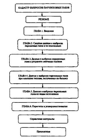 В Кадастре должны быть использованы форматы для представления данных в виде электронных таблиц в формате Excel на английском языке. В настоящем стандарте приведены таблицы, в которых переведены на русский язык наименования граф, столбцов и ячеек для данных, относящихся к ОАО "Газпром". В электронном виде таблицы должны быть представлены как связанные воедино листы файла Excel. В тексте и таблицах настоящего стандарта даются ссылки на ячейки таблиц применительно к файлам Excel. Используется нумерация строк и ячеек, аналогичная стандартному английскому оригиналу, утвержденному органами РКИК. Например, ячейка "!Н20" таблицы 3.3. В таблицах все ячейки, обязательные для Кадастра ОАО "Газпром", выделены жирной рамкой. Информация по различным объектам одного производственного уровня должна содержать обязательный набор сведений, свойственных этому уровню, представленных в унифицированной форме для обеспечения их сопоставимости. В Кадастре состав и форма предоставления обязательных сведений для объектов разных уровней должны быть взаимно увязаны таким образом, чтобы обеспечить их преемственность. 5 Требования к содержанию и оформлению КадастраВ данном разделе стандарта приведены общие требования к изложению и оформлению Кадастра последовательно по его структурным элементам. Содержание каждого структурного элемента Кадастра в зависимости от его особенностей следует излагать в виде текста, таблиц, графического материала (рисунков, схем, диаграмм) или их сочетаний. 5.1 Требования к изложению и оформлению структурного элемента "Резюме"Элемент "Резюме" излагается в свободной форме в виде текста с графиками и иллюстрациями, ориентированного на широкое использование в презентациях и в средствах массовой информации. В резюме Кадастра должна кратко излагаться следующая информация: - справочная информация о кадастрах парниковых газов и проблеме изменения климата (краткое изложение основных фактов из раздела 1.1 Главы 1); - сводные данные о выбросах парниковых газов ОАО "Газпром" в период с 1990 г. до года составления Кадастра; - обзор оценок и тенденций для различных источников выбросов парниковых газов на период до 2012 г. и в перспективе до 2020 г.; - прочая информация (в частности, о проектах совместного осуществления: приоритеты, проектные предложения, критерии и порядок экспертизы и т.п.). 5.2 Требования к изложению и оформлению структурного элемента "Глава 1 Введение"Элемент "Глава 1 Введение" Кадастра излагается в свободной текстовой форме и должен включать следующие восемь разделов, обязательных в соответствии с рекомендациями РКИК [4]. 1.1 Справочная информация о кадастрах парниковых газов и проблеме изменения климата (применительно к работе ОАО "Газпром" для представления широким слоям населения). 1.2 Описание порядка подготовки Кадастра в ОАО "Газпром". 1.3 Краткое описание процесса подготовки Кадастра (сбора данных, их обработки и хранения). 1.4 Краткое описание использованных методологий и источников данных. 1.5 Краткое описание наиболее значимых источников выбросов метана и диоксида углерода. 1.6 Информация о процедуре оценки качества данных и контроля качества составления Кадастра (внутренний контроль, рецензирование и т.п.), вопросы конфиденциальности. 1.7 Общая оценка погрешности данных Кадастра, включающая оценку неопределенности первич