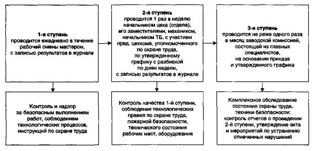 Раздел I. Трехступенчатый контроль охраны труда1. Область применения1.1. Настоящий стандарт устанавливает порядок проведения трехступенчатого контроля (текущего мониторинга и мониторинга превентивных мер) в соответствии с п. 4.5.1 OHSAS 18001-1999 и п. 6.1 ГОСТ Р 12.0.006-2001. 1.2. Положения настоящей процедуры распространяются на все механические, сборочные, вспомогательные подразделения. 2. Нормативные ссылкиВ настоящем стандарте использованы ссылки на следующие документы: - OHSAS 18001-1999 "Система менеджмента профессиональной безопасности и здоровья"; - ГОСТ Р 12.0.006-2002 "ССБТ. Общие требования к системе управления охраной труда в организации"; - Ведомость государственных стандартов системы стандартов безопасности труда. 9Е004062. 3. Термины и определенияВ настоящем стандарте применяются следующие термины с соответствующими определениями. Контроль - процедура оценки соответствия путем наблюдения и суждений, сопровождаемых соответствующими измерениями, испытаниями или калибровкой. Мониторинг - систематическое наблюдение за чем-либо. Несоответствие - любое отклонение от стандартов, установившейся практики, процедур, правил, надлежащего функционирования системы управления и т. д., которое прямо или косвенно может привести к травме или заболеванию, ущербу собственности, негативному изменению рабочей среды, или комбинация этих факторов. Процесс измерения - совокупность операций для установления значения величины. 4. Обозначения и сокращенияОТ - охрана труда. СУОТ - система управления охраны труда. КД - корректирующие действия. ПД - предупреждающие действия. ССБТ - система стандартов безопасности труда. ___________ *Стандарт разработан коллективом отдела охраны труда ОАО "РПЗ". 5. Основные положения5.1. Ответственность5.1.1. Ответственным за проведение первой ступени контроля являются мастера подразделений, в которых осуществляется мониторинг. 5.1.2. Ответственным за проведение второй ступени контроля являются начальники подразделений, в которых осуществляется мониторинг. 5.1.3. Ответственным за проведение третьей ступени является главный инженер. 5.2. Общие положения5.2.1. Трехступенчатый контроль безопасности труда осуществляется на соответствие требованиям государственных стандартов ССБТ, перечень которых представлен в ведомости 9Е004062. Схема трехступенчатого контроля приведена в приложении А. 5.2.2. Первая ступень контроля ОТ проводится ежедневно в течение рабочей смены технологами, контролерами, мастерами и другими непосредственными руководителями. При этом производятся контроль и надзор за безопасным выполнением работ подчиненными, соблюдением ими технологических процессов, инструкций по охране труда, техническим состоянием рабочих мест и оборудования. Все замечания по ОТ записываются в журнал мастера (приложение Б) и при необходимости докладываются начальнику цеха (отдела). За каждое нарушение правил ОТ мастер или другой непосредственный руководитель может депремировать нарушителя на 10% через экономиста и руководителя цеха (отдела). 5.2.3. Вторая ступень контроля состояния ОТ проводится раз в неделю начальником цеха (отдела), его заместителями, начальником технологического бюро, бюро технического контроля, механиком, энергетиком цеха с участием предцехкома, старшего общественного инспектора цеха по ОТ по составленному начальником цеха (отдела) 