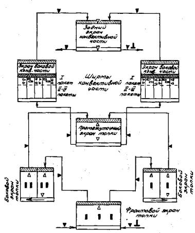 Рис. 1. Схема экспериментального контроля НРЧ котла ТГМП-314: Примечания: 1. На схеме показаны измерения по потоку А. По потоку Б установлены погружные термопары аналогично потоку А. 2. Измерения по потоку Б аналогичны потоку А. 3. Нумерация панелей и змеевиков - от осей котла. 4. Измерения температур и расходов по пароводяному тракту выполняются в соответствии со схемой КИП и А котла.