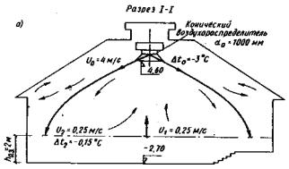 3.13. Максимальную высоту, на которую опускается струя нагретого воздуха, находят по формуле Zmax = 0,58Hг, м. (36) 3.14. Вычисленные величины U2 и Δt2 не должны превышать допустимых величин скорости Uд и разности температур Δtд, а максимальная высота опускания нагретой струи Zmax должна быть не менее (h - hо.з). 4. РАСПРЕДЕЛЕНИЕ ВОЗДУХА