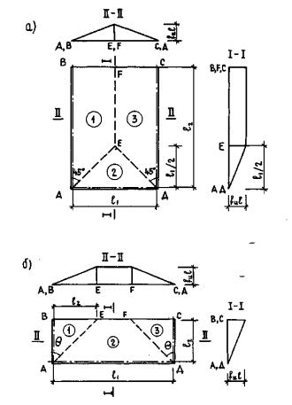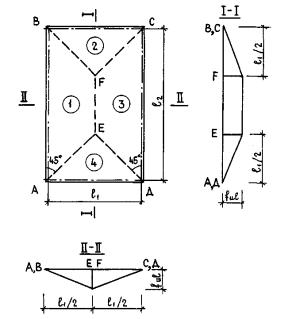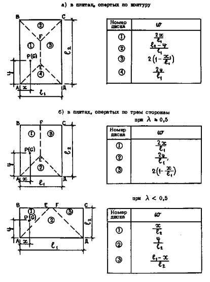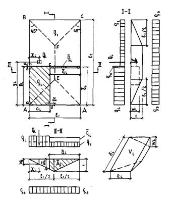 Аi, линейных нагрузок где vi; Ai - объемы и площади фигур, образующихся под соответствующими нагрузками при вертикальном перемешивании точек Е и F на безразмерную единицу (см. рисунки 5, 6; прилож. 2); wi - ординаты точек под грузами Qi, при том же перемещении точек Е и F (см. рисунки 5, 6; прилож. 2); v - объем тела, образующегося под всей плитой при том же перемещении точек Е и F. Для плит, опертых по контуру,