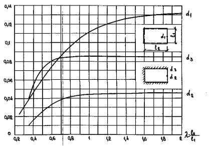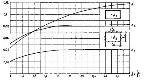 где Mi, - действующий момент от нормативной нагрузки в i-ом сечении; Мсгс,i - момент трещинообразования (внутренних сил) с i-гo сечения. Величины действующих моментов Мi находятся по формулам строительной механики в зависимости от вида опирания и соотношения пролетов исходя из упругой работы перекрытия. Для плит, опертых по контуру и трем сторонам с защемлением на опорах, . максимальные изгибающие моменты перед образованием трещин вычисляются по формулам: где a1, a2, a3 - коэффициенты (рисунки 7 и 8); qs и qr- находятся по формулам (3.1) и (3.2); b = 1 м (1 см); Кsup =1,1 - коэффициент, учитывающий перераспределение усилий с пролета на опоры при длительном действии нагрузки. Для плит, свободно опертых по контуру, а также по трем сторонам при λ ≥ 1 или при λ < 1, но с закрепленными углами А и Д (прижатыми или защемленными краями АД или АВ и СД) максимальные действующие пролетные моменты следует определять по формуле (3.5), принимая qr = 0 и заменяя qs полной нормативной нагрузкой qn. При незакрепленных углах величины моментов умножаются на коэффициент К0 - 1,05. В плитах, свободно опертых по трем сторонам при λ < 1 с незакрепленными углами, моменты следует определять как для балочных плит пролетом l1.