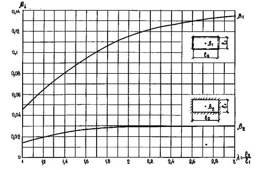Рис. 9. Коэффициенты βi для расчета прямоугольных плит, опертых по контуру, при свободном опирании β1 и защемлении β2 Рис. 10. Коэффициенты βi, для расчета прямоугольных плит, опертых по трем сторонам, при свободном опирании β1 и защемлении β2 λ > 2 значения βi принимаются как при λ = 2 Для плит, свободно опертых по контуру и трем сторонам при λ ≥ 1 или λ < 1 с закрепленными углами А и Д (прижатыми шарнирно или защемленными краями АД или АВ и СД) прогиб следует определять по формуле (3.9), принимая qrl = 0 и заменяя qs величиной ql. При незакрепленных углах величины прогибов следует умножать на коэффициент К0 = 1,05. При λ < 1 прогиб свободно опертых по трем сторонам плит с незакрепленными углами следует определять как балочных плит пролетом l1. Прогиб балочных плит следует определять согласно общим нормативным документам [15, 17, 20] с учетом защемления в платформенных стыках. Расчет прогибов при наличии трещин 3.4. Прогиб плит, опертых по контуру, а также по трем сторонам при λ ≤ 1,5 (при λ < 1 с закрепленными углами А и Д), в случае образования трещин в пролете определяется по формулам: при qcrc > ql при qcrc ≤ qc