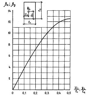 где βxi, βyi - коэффициенты, определяемые по графикам на рис. 11; Qi - сосредоточенные нагрузки. Равномерно распределенные и линейные нагрузки местного характера сначала приводятся соответственно к четырем и двум сосредоточенным нагрузкам, а затем также к эквивалентным равномерно распределенным по формуле (3.36). Для плит, опертых по трем сторонам, при расположении сосредоточенных, линейных и местных равномерно распределенных нагрузок преимущественно на половине, противоположной свободному краю, все нагрузки следует заменять эквивалентной равномерно распределенной по всей плите, определяемой по формуле