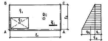 Остальные обозначения те же, что в выражениях (2.1), (2.2). 2.7. Прочность плит, свободно опертых по трем сторонам (при l < 1 необходимо хотя бы шарнирное прижатие края АД или краев ВС и СД весом конструкций не менее одного этажа), при равномерно распределенной нагрузке q считается обеспеченной, если выполняются условия: при λ ≥ 0,5 при λ < 0,5 где 2.8. Прочность плит, опертых по двум сторонам (балочных), проверяется согласно [15, 17, 20]. Расчет прочности плит с неравномерными нагрузками 2.9. При наличии нескольких