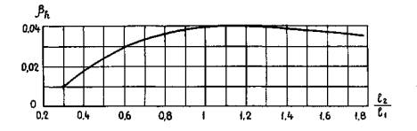 где Pi, Li, - протяженность i-й линейной нагрузки; Ai - площадь под i -й равномерно распределенной нагрузкой. Рис. 11. Коэффициенты приведения сосредоточенных нагрузок к равномерно распределенным, эквивалентным по прогибу, для расчета плит, опертых по контуру Рис. 12. Схема приведения сосредоточенных и местных равномерно распределенных нагрузок к эквивалентным по прогибам гидростатической и равномерно распределенной Рис. 13. Коэффициент βh для расчета плит, свободно опертых по трем сторонам и не опертых по четвертой стороне (ВС), при гидростатической нагрузке 3.9. У плит, опертых по трем сторонам, при нагрузках у свободного края большей интенсивности, чем на остальной части плиты (см. рис. 6), расчет производится в следующем порядке: 1) при λ > 1,5 трещиностойкость и прогибы проверяются как для плиты, опертой по двум сторонам (балочной), пролетом l1 и шириной b = l2 - 1,5 l1 , на нагрузки, расположенные на участке b и приведенные к равномерно распределенной нагрузке также по балочной схеме, с учетом (при наличии) защемления в платформенных стыках; 2) при λ ≤ 1,5 сначала определяются изгибающие моменты у свободного края от равномерно распределенной нагрузки q1, расположенной по всей площади плиты (см. п. 3.2), затем все остальные нагрузки приводятся к линейной, расположенной у свободного края