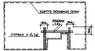 Рис. 16. Схема расположения компенсирующих стержней по периметру вырезов (отверстий) 7. ПРИМЕРЫ РАСЧЕТА ПРИМЕР 1. Определить расчетное армирование, проверить прогиб и при необходимости раскрытие трещин опертой по контуру плиты для конструктивной ячейки 3,6 × 6 м, толщиной 12 см, защемленной на опорах стенами в платформенных стыках. Нагрузки равномерно распределены по площади. 1) Исходные данные. Плита кассетного производства. Бетон тяжелый класса В15 с расчетными характеристиками (МПа): Rb = 6,5 (при γb2 = 0,9; γb3 = 0,85; Rbt,ser = 1,15; Eb = 20900. Арматура вдоль пролета l1 из стали класса А-III диаметром 6 - 8 мм, вдоль пролета l2 из проволоки класса Вр-1 диаметром 5 мм; расчетные характеристики арматуры (МПа): Rs1 = 355; Rs2 = 360; защитный слой бетона до нижнего ряда арматуры в свету 1,5 см; армирование в направлении l1 неравномерное (см. рис. 15, а) с коэффициентом концентрации φс = 2; армирование в направлении l2 равномерное. Нормативные нагрузки (кПа): от собственного веса qw = 3, нагрузка от конструкций пола, прикладываемая после защемления стенами, Pr = 0,8, временная Рn = 1,5, в том числе длительно действующая Pl = 0,3. 2) Сочетания нагрузок (кПа): расчетная q = qw 1,1 + Pr 1,2 + Pn 1,3 = 3·1,1 + 0,8·1,2 + 1,5·1,3 = 6,21; для проверки трещинообразования qs = qw = 3; qr = Pr + Pn = 0,8 + 1,5 = 2,3; для проверки прогибов и раскрытия трещин qrl = Pr + Pl = 0,8 + 0,3 = 1,1; qn = qs + qr = 3 + 2,3 = 5,3; ql = qs + qrl = 3 + 1,1 + 4,1. 3) Подбор рабочей арматуры по условию прочности. Плита рассматривается как свободно опертая с закрепленными от подъема углами. Расчетные пролеты (см): l1 = 352; l2 = 592; рабочие высоты (см): h01 = 10,1; h02 = 9,5; λ = l2/l1 = 592/352 = 1,68; γ = l1/h = 352/12 = 29,4; коэффициент m = 0,43 (см. рис. 2); коэффициент Ksp = 0,86 (см. рис. 3, б).