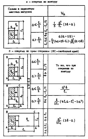 в) сосредоточенные (кН) Qi, - то же. Действующие усилия Msp - момент в пролете от нормативной нагрузки на 1 м в сечении 1-1 в центре при опирании по контуру и у свободного края при опирании по трем сторонам; Msup - то же в опорных сечениях; m - отношение максимальных моментов на 1 м сечений, нормальных к пролетам l2 и l1; m = m2/m1; αi- табличные коэффициенты для определения моментов Мi. Внутренние усилия