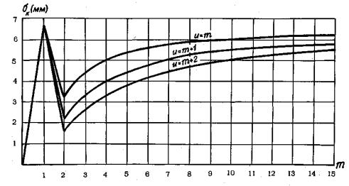 Рис. 2.4. Зависимость среднего квадратического отклонения размера зазора в вертикальном стыке между ВС σК от числа размеров зазоров m в цепи сопрягаемых элементов (п.5 табл. 2.1)