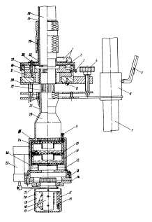 Рис. 2. Лазерный сканирующий нивелир с компенсатором: 1 - уровни; 2 - цилиндрическая обойма крепления кожуха коллиматора; 3 - юстировочный винт; 4 - регулировочный винт; 5 - боковой стопорный рычаг; 6 - тубус; 7 - штанга; 8 - стопорный винт; 9 - стопорный винт с компенсаторной пружиной; 10 - цилиндрический корпус блока стабилизации; 11 - блок пространственной стабилизации; 12 - окно; 13 - нижняя крышка; 14 - основание с подшипников; 15 - защитное стекло; 16 - обойма с оптическим клином; 17 - пентапризма; 18 - цилиндрическая оправа; 19 - блок сканирования; 20 - защитный кожух; 21 - ременная передача; 22 - двигатель; 23 - механический клиновой компенсатор; 24 - жидкостная металлическая кювета; 25 - стеклянная защитная пластина; 26 - коллиматор; 27 - влагопылезащитный кожух; 28 - цанговый зажим; 29 - кремальера; 30 - трегер; 31 - подшипник скольжения; 32 - крепежный винт; 33 - цилиндрическая обойма крепления кожуха излучателя; 34 - защитный кожух излучателя; 35 -лазерный излучатель, Линейная несоосность между осью вращения и осью лазерного луча компенсируется посредством перемещения основания обоймы крепления защитного кожуха излучателя, а линейная несоосность между осью коллиматора и осью вращения - посредством перемещения основания обоймы крепления защитного кожуха коллиматора с помощью трех боковых регулировочных винтов. Трегер предназначается для крепления лазерного сканирующего нивелира к вертикальной штанге и выставки его лазерного луча в отвесное положение. Он представляет собой сочетание верхнего и нижнего оснований и трех регулировочных винтов. К нижнему основанию прикреплен тубус, с помощью которого трегер крепится к штанге. Фиксация тубуса на штанге производится с помощью стопорного рычага. Штанга представляет собой стержень со специальным цанговым зажимом. В зависимости от условий применения ЛСНК (стационарная установка или переносной вариант) штанга закрепляется на треноге или внутри защитной кабины. Блок пространственной стабилизации представляет собой компенсатор жидкостного типа. Он состоит из цилиндрического корпуса, внутри которого смонтированы две последовательно размещенные жидкостные металлические кюветы, снабженные тремя плоскопараллельными защитными стеклянными пластинками. Цилиндрический корпус размещается в цилиндрической части защитного кожуха коллиматора и крепится в нем с помощью нижней крышки. Между крышкой и нижним основанием корпуса размещается механический клиновой компенсатор, а между верхним основанием корпуса и верхней плоскостью защитного кожуха коллиматора размещаются три стопорных винта с компенсаторными пружинами. Клиновой компенсатор предназначается для выставки жидкостной кюветы в нейтральное положение, а верхние стопорные винты с пружинами - для фиксации ее пространственного положения. К нижней крышке защитного кожуха коллиматора с помощью трех крепежных винтов прикрепляется блок сканирования, который предназначается для создания лазерной горизонтальной опорной плоскости. Он состоит из основания с запрессованным в его центре подшипником, цилиндрической оправы с пентапризмой, защитного цилиндрического кожуха, двигателя и обоймы с оптическим клином. Цилиндрическая оправа запрессована во внутреннюю обойму подшипника, в ее нижней части имеется выточка под пасик, а под ней - две боковые щечки для крепления пен