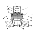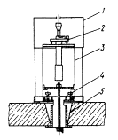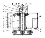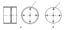 Рис. 7. Устройство начальной выставки: 1 - цилиндрический уровень; 2 - вертикальная зеркальная отражающая грань; 3 - верхняя цилиндрическая обойма; 4 - нижняя цилиндрическая обойма; 5 - становой винт; 6 - трегер; 7 - нижняя плоскопараллельная шайба с отверстием; 8 - нижняя зеркальная отражающая грань; 9 - верхняя плоскопараллельная шайба Верхняя шайба своей зеркальной поверхностью соприкасается с зеркальной поверхностью нижней шайбы. На боковой поверхности верхней шайбы имеется скос с зеркальной поверхностью, перпендикулярный ее нижней поверхности. Скос служит для создания опорной вертикальной зеркальной поверхности. Горизонтальная опорная зеркальная поверхность создается нижней зеркальной поверхностью верхней шайбы. В соответствии с размерами скоса сделано отверстие в боковой поверхности верхней обоймы. Цилиндрический уровень предназначается для настройки УНВ, т.е. выставки нижней и боковой зеркально отражающих плоскостей соответственно в горизонтальное и вертикальное положения. Он закрепляется на верхнем основании обоймы верхней шайбы. Цена деления уровня в пределах 10". Для исключения попадания пыли и влаги внутрь УНВ, а в частности на соприкасающиеся между собой поверхности шайб на них наносится тонкий слой веретенного масла. Кроме того, верхняя цилиндрическая обойма, имея диаметр больше диаметра нижней обоймы, перекрывает ее, обеспечивая дополнительную герметичность УНВ. Становой винт предназначается для крепления УНВ с помощью трегера в исходное рабочее положение. Для свободного прохождения лазерного луча в нижних пластинах основания трегера и становом винте имеются отверстия диаметром 30÷35 мм. Дифракционные диафрагмы монтируются на выходных отверстиях ЛЗЦВ и ЛСНК. Они применяются при начальной выставке ЛЗЦВ и ЛСНК с помощью УНВ по дифракционному методу. Дифракционные диафрагмы (рис. 8) используются двух видов: диафрагмы, выполненные в виде тубуса и в виде круглой пластины. По центру и их периферии располагаются пять отверстий каждое диаметром 1÷1,5 мм. Для повышения контрастности наблюдения на поверхности диафрагм дифракционных колец отраженного от УНВ лазерного излучения, они окрашиваются в красный цвет.