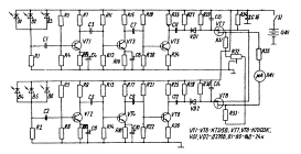 необходимости его можно с помощью переходного кабеля вынести на расстояние до Усилительно-преобразовательный блок (рис. 11) состоит из источника питания и электронного усилителя. Он размещается внутри корпуса фотоголовки. В качестве источника писания используется источник постоянного напряжения 9 В (батарейка "Корунд"). Усилительная часть состоит из двух идентичных каналов, представляющих собой трехкаскадные усилители, собранные на транзисторах по схеме ток-напряжение VT1-VT6. Для создания более широкой зоны захвата на вход каждого канала включено по три параллельно соединенных фотодиода B1, В2, В3 и В4, В5, В6. С выхода каждого канала напряжение сигнала подается на однополупериодные выпрямители (детекторы) VD1 и VD2, а выпрямленное напряжение - на вход мостовой схемы (сравнивающее устройство), собранное на транзисторах VT7÷VT8. С выхода мостовой схемы сигнал рассогласования поступает на стрелочный индикатор.