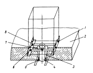 Между передней точкой крюка и планкой расположена пружина, обеспечивающая необходимое натяжение мерной ленты. В рабочем положении крюк зацепляют за крайний конец панели перекрытия. Устройство фиксации начала ленты рулетки и положения лазерной вертикальной плоскости (рис. 19) состоит из двух самостоятельных узлов (верхнего и нижнего). Верхний узел предназначен для крепления начала мерной ленты и фотоголовки ФГРС, с помощью которой производится регистрация пространственного положения лазерной вертикальной плоскости, создаваемой с помощью УСЛВ, а нижний узел - для крепления верхнего узла в конусообразном проеме панели перекрытия. Верхний узел представляет собой совокупность двух зажимных планок, снабженных стопорными винтами, между которыми пропускается мерная лента рулетки. К верхней планке крепится вертикальная панель с двумя горизонтальными направляющими, в которые вставляется фотоголовка ФГРС и по которым она может свободно перемещаться. Для фиксации фотоголовки ФГРС (после ее выставки относительно лазерной вертикальной плоскости УСЛВ) служит стопорный винт. Нижняя планка представляет собой прямоугольную пластину, в средней части которой закреплена распорная конусообразная планка. Нижний узел представляет собой совокупность двух свободно подвешенных к горизонтальной монтажной пластине крепежных упоров, нижние концы которых соединены между собой с помощью стяжных пружин. Монтаж устройства фиксации производится в такой последовательности: в конусообразный проем панели перекрытия вначале устанавливается нижний узел, а затем в него вставляется верхний узел, который фиксируется с помощью направляющих крепежных упоров и пружин. 2.13. Устройство проектирования опорной геодезической точки и начальной выставки УСЛВ (УПТНВ) предназначается для выноса опорной точки на вертикальную ось визирования, обеспечения выставки (УСЛВ) и построения опорной продольной линии на монтажном горизонте. Оно представляет собой совокупность марки-экрана, палетки, рамки и тубуса (рис. 20). Марка-экран представляет собой экран с двумя вертикальными визирными линиями. Тубус имеет коническую форму с профилем, соответствующим профилю проема в панели перекрытия. Он крепится к нижнему основанию рамки. Палетка представляет собой прямоугольную матированную плексигласовую пластинку, снабженную прямоугольной системой координат, в центре которой располагается отверстие, предназначенное для установки оси марки-экрана. УПТНБ своим тубусом устанавливается в проеме панели перекрытия над ЛЗЦБ, проектирующим на палетку с помощью лазерного луча опорную геодезическую точку. Посредством перемещения палетки производится ее центрирование, т.е. совмещение центра ее перекрестия, а следовательно, и оси марки-экрана с центром проекции лазерного пятна (центром опорной геодезической точки). После центрирования в отверстие палетки устанавливается марка-экран с таким расчетом, чтобы ее визирные линии были обращены в сторону УСЛВ. 2.14. Устройства монтажа и крепления (УМК) предназначаются для крепления и монтажа ЛЗЦБ, ЛСНК, УСЛГ и УСЛВ на рабочем основании строительной площадки. Устройство крепления ЛЗЦВ (рис. 21) предназначается для монтажа ЛЗЦВ над проемом панели перекрытия. Оно состоит из столика с четырьмя ножками и крепежного стержня. На верхнем 