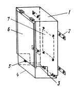 Рис. 16. Защитная кабина ЛСНК: 1 - корпус кабины; 2 - монтажная металлическая полоска; 3 - вырез для лазерного луча; 4 - нижняя откидная сторона; 5 - петля для замка; 6 - лицевая откидная сторона; 7 - вырез для устройства крепления ЛСНК На подвижных сторонах корпуса кабины имеются петли для установки замка. С помощью металлических полос производится крепление защитной кабины к рабочему основанию на стройплощадке. 2.11. Устройство сканирования лазерного луча ЛЗЦ в вертикальной плоскости (УСЛВ) предназначено для создания опорной нестабилизированной лазерной вертикальной плоскости и лазерных вертикальных направляющих (рис. 17). Оно представляет собой теодолит типа Т-30, снабженный съемными блоками (двигателя, сканирования и питания). Блок двигателя состоит из основания, защитного кожуха, малогабаритного двигателя и обоймы крепления двигателя к основанию. В качестве двигателя применяется двигатель постоянного тока типа ДПМ-25.