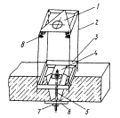 Рис. 15. Устройство крепления защитной кабины ЛЗЦВ: 1 - крепежный болт; 2 - панель перекрытия; 3 - проем панели перекрытия; 4 - цилиндрический тубус; 5 - лапка тубуса; 6 - уголок кабины; 7 - болт фиксации тубуса; 8 - уголок крепления тубуса с болтами На этих гранях имеются по три отверстия с резьбой для болтов - одно центральное и два боковых. Боковые болты выполняют роль прижимных, а центральные - роль фиксирующих, удерживающих уголок в прорези тубуса. Боковые прижимные болты упираются на плоскости уголков, прикрепленных к основанию кабины с противоположных сторон. При закручивании прижимных болтов происходит подъем тубуса и его прижим к основанию кабины, а кабины - к панели перекрытия. Защитная кабина ЛСНК (рис. 16) представляет собой металлический прямоугольный корпус, на наружной стороне задней стенки которого располагаются две металлические пластины с отверстиями. Лицевая и нижняя части торцовой стороны подвешены на петлях и могут открываться, причем лицевая сторона может подниматься вверх, а нижняя опускаться вниз. На передней, боковых и задней стенках корпуса кабины имеются вырезы, причем вырезы на передней и боковых стенках предназначены для прохождения через них сканирующего лазерного луча, а на задней стенке - для прохождения через него пластины устройства крепления ЛСНК. Вырезы на передней и боковых стенках в нерабочем положении закрываются нижней торцовой стороной корпуса, имеющей их конфигурацию.