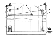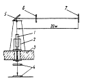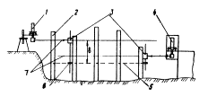 Рис. 26. Схема размещения ЛСНК и ФГРС при нивелировании свайного поля и ростверков: 1 - ЛСПК; 2 - свая; 3 - ФГРС; 4 - ЛСНК в защитной кабине при стационарной установке; 5 - горизонт обрубки свай; 6 - подвижный визир ФГРС; 7 - лазерная плоскость ЛСНК Устройство начальной