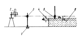 Рис. 35. Схема нивелирования ростверков с помощью лазерной подсистемы нивелирования свайного поля и ростверков: 1 - реперная точка; 2 - ЛСНК; 3 - ФГPC; 4 - проектное положение поверхности ростверка; 5 - начальная контрольная точка; 6 - ростверк закрепить ЛСНК на треноге в таком высотном положении, при котором фотоголовка на геодезической рейке после ее выставки (стрелка индикатора занимает нулевое положение) будет находиться над плоскостью ростверка; привести ЛСНК по уровням в рабочее положение, для чего винтами трегера выставить пузырьки его уровней в нуль-пункты; установить по согласованию с геодезистом геодезическую рейку в начальную контрольную точку ростверка, высотное положение которой Δв0 по отношению проектного ее положения известно; перемещая фотоголовку геодезической рейки, добиться установления стрелки ее индикатора в нулевое положение. Высотное положение фотоголовки Нк будет характеризовать положение лазерной опорной плоскости относительно начальной контрольной точки; снять по шкале рейки отсчет Нк. Высотное положение фотоголовки Н0 (лазерной опорной плоскости) относительно проектного положения начальной контрольной точки можно определить с помощью соотношения: Н0 = Нк ± Δв0, поочередно устанавливая рейку в другие контрольные точки, определить по ее шкале их высотные положения Н1 и Н2 и т.д. относительно лазерной опорной плоскости; с помощью соотношения Δв1,2,3 = Н0 - Н1,2,3 определить превышения контролируемых точек относительно их проектного положения. По результатам измерений производится соответствующая корректировка поверхности ростверка. Периодичность контроля настройки лазерной подсистемы 6.13. Контроль формирования лазерной горизонтальной опорной плоскости, создаваемой с помощью ЛСНК, проводимый с помощью цилиндрических уровней (пузырьки уровней занимают среднее положение), необходимо выполнять перед началом каждой работы с лазерной подсистемой. 6.14. Контроль выставки лазерного луча ЛСНК в горизонтальное положение, проводимый с помощью УНВ, необходимо выполнять через каждые 10÷15 дней работы с лазерной подсистемой согласно методике, изложенной в п. 6.8. 6.15. Контроль выставки лазерного луча ЛСНК на "бесконечность" необходимо проводить через 1,5÷2 мес. согласно методике, изложенной в п. 6.7. 6.16. Юстировку УНВ необходимо проводить согласно методике, изложенной в п. 3.6, каждый раз перед началом использования данного устройства. 6.17. Юстировку лазерной геодезической рейки необходимо проводить каждый раз перед началом работы с ней согласно методике, изложенной в п. 6.9. 6.18. Перед каждым включением лазерной подсистемы необходимо проводить внешний осмотр ее узлов и средств их защиты, обращая при этом особое внимание на герметичность защитной кабины ЛСНК и устройств индивидуальной защиты ЛСНК и ФГРС, а также на состояние светофильтров ФГРС и ее солнцезащитных приспособлений. При необходимости поверхность защитных стекол ЛСНК и светофильтров фотоголовки ФГРС следует протереть чистой фланелевой тканью. Ремонт аппаратуры лазерной подсистемы 6.19. В случае отказа ЛСНК (отсутствие лазерного излучения) и лазерной геодезической рейки (отсутствие отклонения стрелки стрелочного индикатора) необходимо прежде всего выяснить причину отказа и постараться своими силами устранить ее. 6.20. В случае отказа ЛСНК его проверку необ