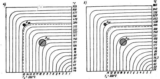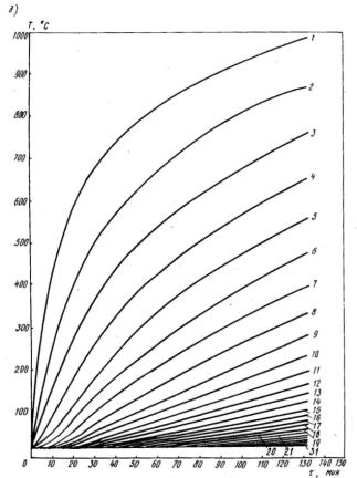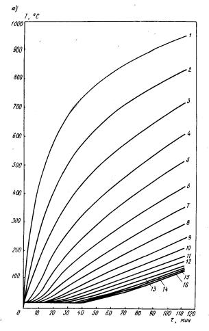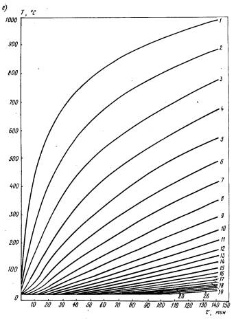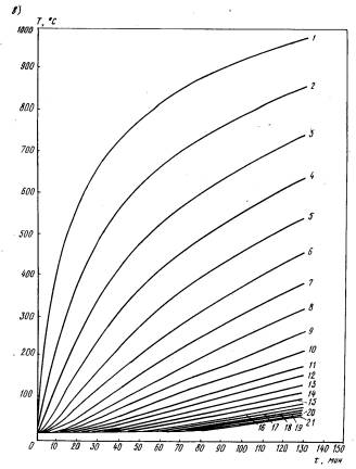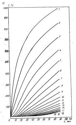 2.6. Расчет температурного поля в сечении конструкции производится конечно-разностным методом в зависимости от количества обогреваемых поверхностей и их взаимного расположения. 2.7. Температуру по сечению прямоугольного элемента при четырехстороннем обогреве определяют следующим образом: вдоль поверхностей - по графикам прогрева (рис. 1), которые вычислены для неограниченной пластины толщиной h/2, где h - расстояние между двумя параллельными поверхностями; температура