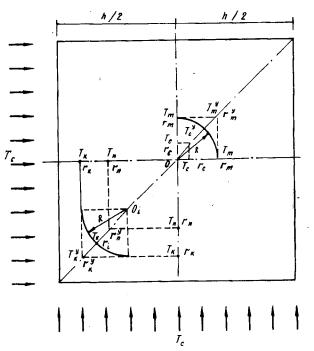 Рис. 2. Схема для определения координат температуры в углу элемента при двух взаимно перпендикулярных обогреваемых сторонах 2.8. На рис. 1 приведены графики прогрева пластин толщиной, равной половине расстояния между двумя обогреваемыми поверхностями; они вычислены с помощью ЭВМ "Искра-226" по специально разработанной на кафедре "Строительной конструкции" МИИТа программе. 3. РАСЧЕТ НЕСУЩЕЙ СПОСОБНОСТИ ПОЛИМЕРБЕТОННЫХ И АРМОПОЛИМЕРБЕТОННЫХ СЖАТЫХ ЭЛЕМЕНТОВ ПРИ ОГНЕВОМ ВОЗДЕЙСТВИИ3.1. При расчете несущей способности полимербетонных и армополимербетонных конструкций следует учитывать изменение механических свойств полимербетона и арматуры в зависимости от температуры, определенной теплотехническим расчетом. Допускается не учитывать в расчете самоуравновешенные температурные напряжения в конструкции. 3.2. Расчетные