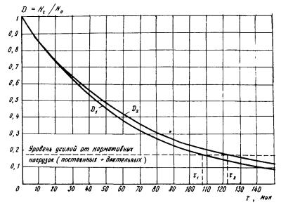элемента с размерами 40´40´360 см Найдем предел огнестойкости колонны через 100 мин огневого воздействия. На рис. 3,а показано распределение температуры по сечению элемента через 100 мин нагрева. Проделав аналогичные вычисления, получаем Фt = 0,84[1909 + (12,56 + 4,52)×44,2 ] = 2238 кН. В качестве расчетного значения нагрузки примем 0,95×2667,5 = 2534,2 кН и коэффициент надежности по нагрузке g = 1,2. Тогда нормативная нагрузка 2534,2/1,2 = 2112 кН. Строится зависимость изменения D = Nt/No от времени воздействия "стандартного" пожара, используя формулу (10). На рис. 4 это кривая D1. Как видим, предел огнестойкости заданного сжатого элемента равен t1 = 108 мин, т.е. ниже 120 мин. Примем основную рабочую арматуру As1 диаметром 28 мм. Проведя соответствующие решения, построим аналогичную кривую изменения несущей способности во времени огневого воздействия (см. рис. 4, кривая D2). Предел огнестойкости при заданном уровне нормативной нагрузки будет t2 = 122 мин, что больше нормативного значения 120 мин.