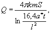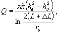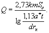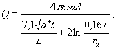 формулы, когда расстояние до границы Запасы дренажных вод безнапорных водоносных горизонтов месторождений, расположенных вблизи рек, определяются по формуле: где L - расстояние от центра месторождения до реки, м; ∆L - дополнительное гидравлическое сопротивление русла реки, определяемое по данным откачек, м. При открытых горных работах в выработках удлиненной формы, когда длина в 10 раз и более превышает ширину, а длина выработки более чем в 2 раза превышает расстояние до реки, запасы дренажных вод рассчитываются на 1 м выработки: где L - расстояние от оси выработки до реки, м. Расчет формулы (12) выполняемся в тех случаях, когда радиус "большого колодца" превышаем расстояние до реки. Учитывая, что для подсчета запасов дренажных вод время исчисляется десятилетиями, рекомендуется проводить расчеты у рек по формулам установившейся фильтрации, так как всегда выполняется условие