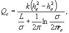 При расположении ряда дренажных скважин между горными выработками и рекой расход одной скважины определяется по формуле где Q - дебит одной дренажной скважины, м3/сут; σ - расстояние между скважинами ряда, м; rо - радиус дренажной скважины, м; Запасы дренажных вод равны Qсn, где n - число скважин. Формулы (11 и 13) действуют при выполнении условия Если подземные горные выработки расположены вблизи непроницаемой границы, то запасы дренажных вод определяются по формуле