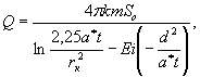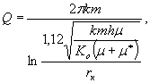 где Q - запасы, м3/сут; h = (0,6 - 0,8) мощности слабопроницаемых отложений, м; μ - коэффициент водоотдачи слабопроницаемых отложений; Kо - коэффициент фильтрации слабопроницаемых отложений, м/сут; μ* - коэффициент упругой водоотдачи нижнего напорного горизонта. При расчетах следует учитывать, что формула (18) действительна только при условии