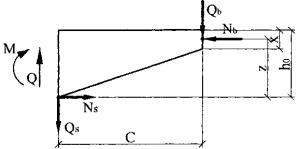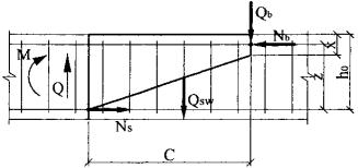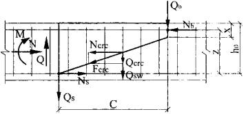 Рис. 6 Уравнение равновесия выглядит следующим образом: Q = Qb; Nb = Ns; M + Qc = Nsz, где уравнение равновесия моментов записано относительно точки приложения усилий в бетоне над наклонной трещиной. Решение этой системы уравнений можно представить в следующем виде. Из уравнения равновесия моментов определяем продольное усилие в арматуре
