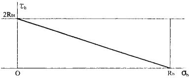 Рис. 4 Полученные уравнения можно представить в виде криволинейного графика в координатах нормальных и касательных напряжений, показанного на рис. 4. Можно видеть, что при нулевых значениях нормальных напряжений σb = 0 предельные касательные напряжения τb,ult равны прочности бетона на растяжение Rbt, далее с увеличением нормальных напряжений σb предельные касательные напряжения τb,ult вначале увеличиваются до некоторого максимума, примерно равного 2Rbt при нормальных напряжениях σb, примерно равных 0,5Rb, а затем уменьшаются до нуля при нормальных напряжениях σb, равных прочности бетона на сжатие Rb. Использовать приведенные выше уравнения, связывающие предельные значения нормальных и касательных напряжений σb,ult и τb,ult достаточно сложно для дальнейшего анализа. Поэтому перейдем к дальнейшим упрощениям. Предельные значения нормальных и касательных напряжений σb,ult и τb,ult можно принять независимыми друг от друга и равными их максимальным значениям, т.е. σb,ult = Rb и τb,ult = 2Rbt либо некоторым средним значениям, например, σb,ult = 0,5Rb, τb,ult = 1,5 Rbt. Можно криволинейный график, отображающий связь между предельными значениями нормальных и касательных напряжений, заменить на линейный, например, показанный на рис. 5. Этот график выражается уравнением