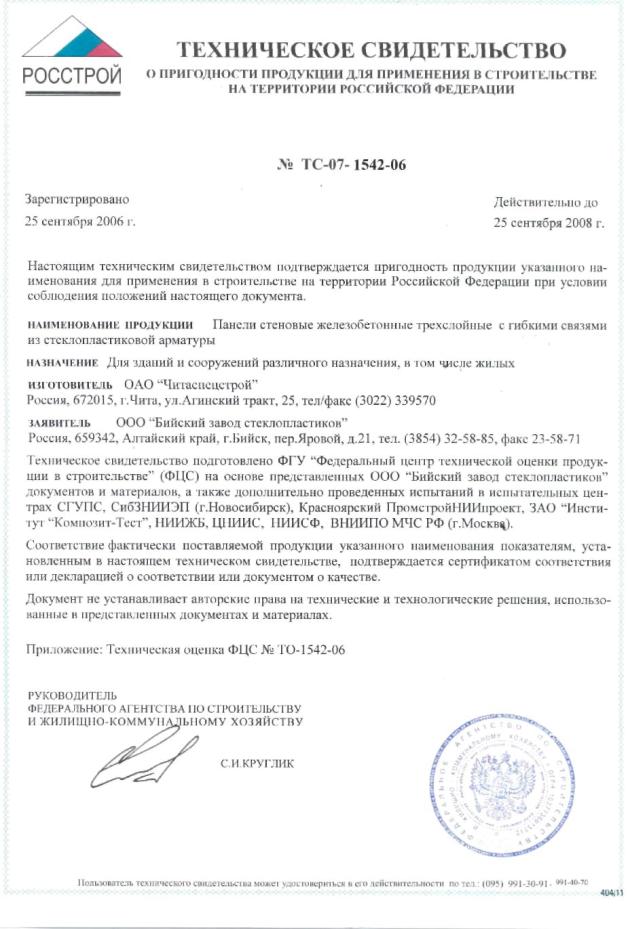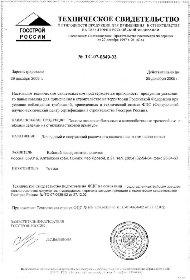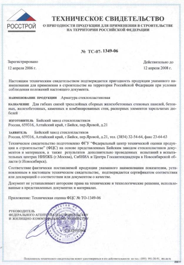 7.2. Техническое свидетельство Госстроя России № ТС-07-0637-02 от 27.12.2002 г. на арматуру стеклопластиковую для гибких связей сборных железобетонных трехслойных стеновых панелей, бетонных, каменных, комбинированных стен и для армирования бетонных и каменных конструкций.