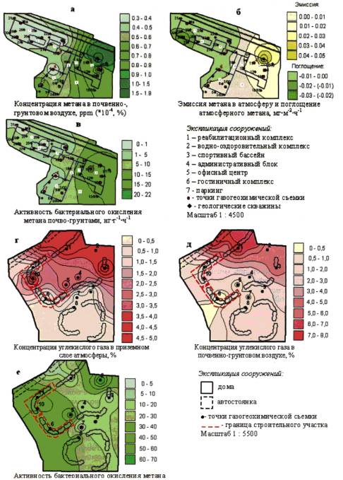 Рис. 1 Картосхемы газогеохимического и микробиологического состояния почво-грунтов на строительных объектах