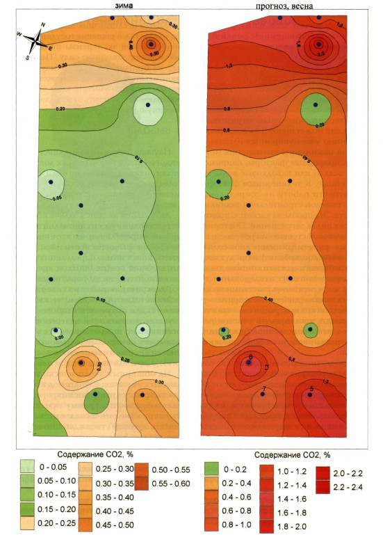 Рис. 2 Картосхема содержания диоксида углерода в почвенно-грунтовом воздухе в зависимости от сезона (Масштаб 1: 1000) На примере нескольких рисунков рассмотрим особенности газогеохимического состояния в зависимости от специфики почв и грунтов. Приведенные на рис. 1 картосхемы свидетельствуют о положительных корреляциях содержания, эмиссии метана и углекислого газа в атмосферном, почвенно-грунтовом воздухе с содержанием органического вещества в насыпных грунтах и почвах. Над областями распространения природных автоморфных почв концентрация метана в почвах минимальна (на приведенном на рис. 1, а примере - до 0,5 ррm) и эмиссия в атмосферу практически не выражена (рис. 1, б). Активность бактериального окисления метана находится на фоновом уровне - до 5 нг/г в час (рис. 1, в). При переходе к насыпным грунтам, содержащим органические слои, концентрация метана в почвах, эмиссия метана в атмосферу, активность бактериального окисления метана увеличиваются. При этом в районах наличия насыпных грунтов с мощными слоями органических веществ газогеохимические показатели достигают максимальных величин. Отведенные под жилую застройку территории бывших свиноферм часто являются существенным источником двуокиси углерода в атмосферу (рис. 1, г-е). В почвах свиноферм скапливается большое количество органического вещества, разложение которого приводит к генерации метана. Как правило, диффундирующий метан, скопившийся в аэробной зоне, интенсивно окисляется метанокисляющими бактериями, поэтому содержание этого газа в таких почвах оказывается невысоким - до 0,3 ррm. При этом активность бактериального окисления метана в некоторых местах оказывается чрезвычайно высокой, способствующей снижению концентрации метана на 3000-4000 ррm. Следствием интенсивного бактериального окисления метана является весьма активное продуцирование диоксида углерода, достигающего в почвах 7-8%, а в приземных слоях атмосферы 5-6%. По существующим нормативам (ГН 2.2.5.2100-06) полученные материалы свидетельствуют о превышении разовых предельно допустимых концентраций диоксида углерода в атмосфере в 5 раз, среднесуточных в 15, а исследованные грунты следует относить к опасным (СП 11-102-97). Это обстоятельство необходимо учитывать при проведении газогеохимических работ и разработке нормативных документов при градостроительстве. С этих позиций мы рекомендуем помимо учета пожароопасной составляющей развивать экологическую компоненту в содержании газогеохимических исследований. При этом необходимо изучать и разрабатывать экологические нормативы не только для атмосферных и свободных газов, находящихся непосредственно в почвенно-грунтовом воздухе, но и для эмиссионных и утилизированных - окисленных биологическим путем - как характеристики количества газов, потенциально способных накопиться в данных грунтах при изменении условий (например, при запечатывании поверхности под асфальтовыми покрытиями, нарушающими газообмен с атмосферой и способствующими восстановительным процессам). Перечень нововведений в свод правил по инженерно-экологическим геохимическим изысканиям был бы неполным без разработки количественных показателей активности бактериального окисления метана, дополняющего преставления об общем содержании метана в газогенерирующем теле. Другим важным недостатко