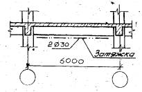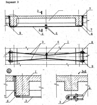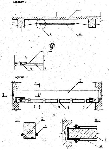 Рис.2 Особенностью усиления балок по второй схеме является обеспечение совместной работы затяжки с усиливаемой конструкцией.. Для этого под нижнюю грань балки устанавливают П-образные сопрягающие элементы из листовой стали (см. поз. 5 рис.1), располагая их друг от друга на расстоянии, не превышающем высоту балки. При выполнении усиления необходимо проконтролировать их плотное прилегание к поверхности балки. Натяжение затяжки производят механическим способом подтягивая гайки на опорных анкерах. При создании значительных предварительных напряжений в тяжах для облегчения затягивания гаек рекомендуется применять прогрев тяжей электротермическим способом или пламенем газовых резаков равномерно по всей длине. Опорные анкеры следует устанавливать, подливая цементный раствор для плотного примыкания их к торцам конструкций. При выполнении затяжки по схеме 3 тяжи подвески устанавливают в проектное положение с предварительным вывешиванием и закреплением монтажными струбцинами. Один из концов тяжа прижимают к опорному анкеру и обваривают. Затем производят нагревание тяжа до расчетной температуры и в нагретом состоянии приваривают другой конец. Нагревание тяжей выполняют с помощью электротрансформаторов или пламенем газовых или бензиновых резаков равномерно по всей длине. В процессе остывания происходит сжатие металла, тем самым достигается предварительное натяжение затяжки и плотное соприкосновение опорных узлов с конструкциями. Затем на тяжи надевается стяжной хомут и выполняют предварительное натяжение затяжки до проектного усилия в тяжах путем стягивания ветвей одновременным подтягиванием гаек. 2.6. В натяжных устройствах рекомендовано резьбу смазывать машинным маслом, гайки применять полуторной высоты, а после окончания натяжения обязательно установить контргайки или зафиксировать гайки обвариванием электросваркой. Для предохранения, затяжек от коррозии их окрашивают, как обычные металлоконструкции. В пожароопасных помещениях и при наличии избыточной влажности конструкции затяжки необходимо покрыть слоем цементной штукатурки или другими покрытиями, состав и толщина которых должна быть определена проектом. После монтажа затяжки отверстия, штрабы и места сколотого бетона необходимо заделать цементным раствором на крупном песке. Места разборки кирпичной кладки необходимо заложить кирпичом или замонолитить бетоном. При выполнении работ следует строго соблюдать требования СНиП 3.03.01-87. 2.7. Пример усиления конструкций горизонтальными затяжками рассмотрен на рис. 3.