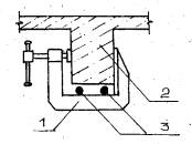 2.4. Настоящей картой предусмотрен следующий порядок производства работ: монтаж трубчатых лесов с устройством рабочего настила; подготовка мест установки - креплений дополнительной арматуры и опорных анкеров (пробивка необходимых отверстий, скалывание бетона, разборка кирпичной кладки и т.п.); монтаж опорных анкеров или креплений дополнительной арматуры (наварка, коротышей); установка конструкций затяжки с приваркой концов к местам крепления или опорным анкерам; натяжение затяжки с помощью натяжных устройств; заделка бетоном борозд, выемок и отверстий; демонтаж лесов и приспособлений. 2.5. При производстве работ по усилению конструкций балок и ригелей горизонтальными затяжками выбор средств подмащивания определяется реальными условиями реконструируемого производства. Подготовка мест установки опорных узлов подразумевает (в зависимости, от конкретных конструкций): удаление железобетона, мешающего установке опорных анкеров, пробивку необходимых монтажных отверстий, очистку опорных участков от кирпичной кладки, скалывание защитного слоя бетона с рабочей арматуры. Разборку кирпичной кладки, скалывание бетона, пробивку отверстий предусмотрено выполнять с применением пневмо- или электроинструмента. Установку дополнительной арматура применяют, как правило, в случаях, когда анкерные устройства нельзя разместить на торцах усиливаемых балок. Дополнительную арматуру крепят к обнаженной рабочей арматуре конструкций возле опорных участков, где напряжения в арматуре незначительны. После скалывания защитного слоя на рабочую арматуру наваривают коротыши, диаметр которых несколько больше толщины защитного слоя. К коротышам приваривают арматуру усиления. Натяжение производят термическим способом. Для этого стержни устанавливают в проектное положение при помощи струбцин (рис.2) или временных подвесок и приваривают один конец к коротышу, второй оставляя свободным. Далее стержень включают в электрическую цепь и нагревают до расчетной температуры. Свободный конец прижимают к коротышу и приваривают. В процессе сварки до полного остывания шва необходимо поддерживать расчетную температуру.
