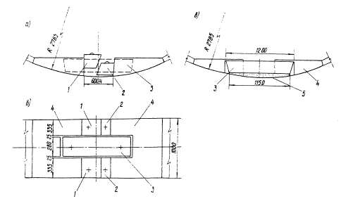 Рис. 4. Конструкция распорного замка: а) вид блока спереди с вставленными, распорными клиньями; б) вид блока сверху с вложенным вкладышем; в) вид блока спереди с вложенным вкладышем. 1 - клиновидный вкладыш К-1; 2 - клиновидный вкладыш К-1а; 3 - центральный вкладыш C-1; 4 - блок обделки 5БЛ-2; 5 - цементнопесчаный раствор Когда кольцевой блокоукладчик находится в составе механизированного комплекса со щитом, разрабатывающим лоб забоя, и когда кольцо монтируют под защитой оболочки щита, его разжимают в два приема. При первом приеме кольцо разжимают с целью погашения строительного зазора между внешней поверхностью кольца и оболочкой щита, при втором приеме - окончательном - опускают кольцо на грунт выработки. При сооружении тоннеля комплексом без щита для разработки грунта забоя в устойчивых грунтах собираемое кольцо обжимается в один прием Гидравлический домкрат, устанавливаемый в нишу сочлененных лотковых блоков, развивает усилие 30 тс. По окончании обжатия кольца обделки в окружающий грунт в стык лотковых блоков вставляют клиновидные вкладыши марки К1, К-1а, а вслед за удалением гидравлического домкрата в нишу вставляют центральный вкладыш на цементно-песчаном растворе C-1. Конструкция заполнения стыка лотковых блоков обеспечивает надежную фиксацию разжатого кольца обделки. Разжатое кольцо обделки плотно прилегает к контуру выработки без наличия строительного зазора. После завершения обжатия кольца кондуктор укладчика складывается, выходит из контакта с блоками собранного кольца обделки и передвигается вперед на забой для монтажа последующего кольца. После завершения цикла работ и передвижки комплекса откаточные пути наращиваются путем раздвижки телескопического звена между рельсами, постоянно закрепленными на технологической платформе и уложенными сварными путями в готовой части тоннеля. При увеличении забоя на 7 пог. м в конце каждой смены телескопическое звено рельсов снимается и вместо него укладывается сварное звено на металлических планках и соединяется накладками с болтами с основными путями. Телескопическое звено укладывается внутри последнего постоянного звена рельсов. Профилактический осмотр блокоукладчика и состава комплекса, а также мелкие ремонтные работы выполняются самой бригадой в периоды, предусмотренные циклограммой работ, а более объемные работы - в нерабочие дни недели специализированной бригадой ремонтников, не входящей в состав проходческой бригады. Плановый ремонт механизмов должен обеспечивать бесперебойную проходку тоннеля. Зона забоя тоннеля