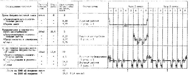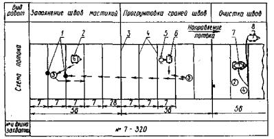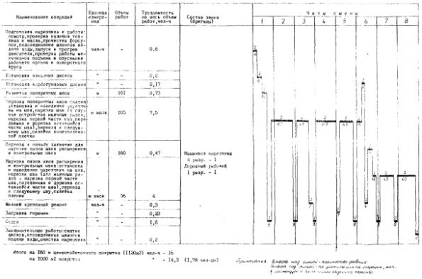 цементобетонных дорожных покрытиях», 6. «Указания по устройству швов в свежеуложенном цементобетонном покрытии автодорог и аэродромов нарезчиком швов ДНШС-60», М., Оргтрансстрой, 1968. При выполнении работ по устройству цементобетонных и железобетонных покрытий рабочие должны строго соблюдать требования и указания по технике безопасности, изложенные в СНиП III-A.11-70 и в «Правилах техники безопасности при строительстве, ремонте и содержании автомобильных дорог» Министерства транспортного строительства и Министерства строительства и эксплуатации автомобильных дорог РСФСР, М., Транспорт, 1969. Основные положения правил техники безопасности приведены в последнем разделе настоящего сборника. В настоящем сборнике технологических карт даны составы звеньев рабочих и технические средства (машины, оборудование и пр.), необходимые для выполнения работ на участке. Рабочие и машины, занятые на доставке материалов (автомобили-самосвалы, поливомоечные машины и др.), в состав рабочих звеньев не включены; их потребность определяют по расчету в зависимости от дальности возки материалов и объемов работ. Количество электростанций для освещения участков работ и количество заправочных машин определяют по потребности. При привязке технологических карт к местным условиям необходимо учитывать конструкцию покрытия и основания, способы нарезки и заполнения температурных швов, и способы ухода за свежеуложенным бетоном. ТЕХНОЛОГИЧЕСКАЯ КАРТА № 1