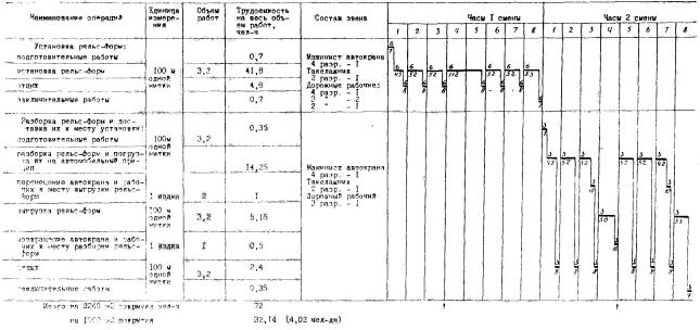Технологическая карта предусматривает работы по установке и снятию рельс-форм высотой 24 см и длиной 4 м при помощи автокрана и транспортировку рельс-форм на двухосном автомобильном прицепе, перемещаемом автокраном.