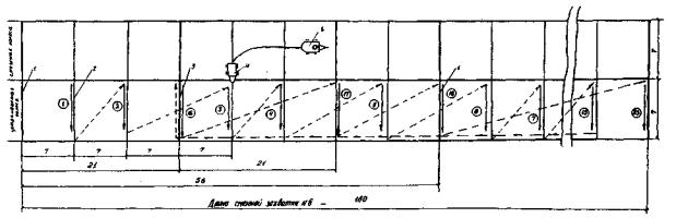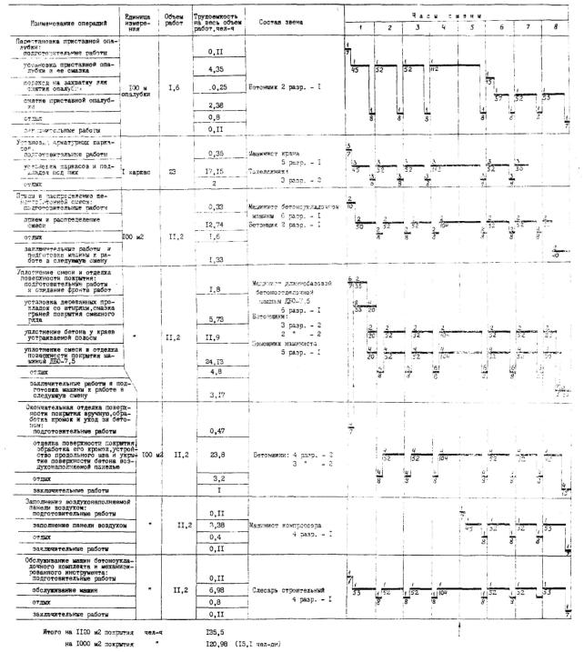 ЦЕНТРАЛЬНЫЙ ИНСТИТУТ НОРМАТИВНЫХ ИССЛЕДОВАНИИ И НАУЧНО-ТЕХНИЧЕСКОЙ ИНФОРМАЦИИ «ОРГТРАНССТРОЙ» МИНИСТЕРСТВА ТРАНСПОРТНОГО СТРОИТЕЛЬСТВА ТЕХНОЛОГИЧЕСКИЕ КАРТЫ УСТРОЙСТВО ЦЕМЕНТОБЕТОННЫХ И ЖЕЛЕЗОБЕТОННЫХ АЭРОДРОМНЫХ ПОКРЫТИЙ МОСКВА 1976 Содержание Технологические карты разработаны отделом внедрения передовых методов труда и технического нормирования в строительстве автомобильных дорог и аэродромов института «Оргтрансстрой» (исполнители В.К. Пишванов, Л.С. Королева и Л.А. Мелешкина). ОБЩИЕ ПОЛОЖЕНИЯТехнологические карты разработаны на основе применения принципов научной организации труда и предназначены для использования при составлении проектов производства работ и при организации труда на объекте взамен технологической карты «Устройство цементобетонных и железобетонных аэродромных покрытий», Оргтрансстрой, М., 1969. Сборник состоит из шести технологических карт: Карта № 1. Устройство битумно-песчаного выравнивающего слоя (захватки № 1 и 3). Карта № 2. Установка и снятие рельс-форм (захватки № 2 и 5). Карта № 3. Устройство цементобетонных покрытий (захватки № 4 и 5). Карта № 4. Устройство железобетонных покрытий (захватки № 4 и 5). Карта № 5. Нарезка швов в затвердевшем бетоне (захватка № 6). Карта № 6. Заполнение швов новыми видами мастик и герметиков (захватка № 7). В настоящих технологических картах предусмотрены: сменный темп укладки - 160 м покрытия; состав комплексной бригады при строительстве: цементобетонных покрытий - 35 чел., железобетонных покрытий - 37 чел., затраты труда на 1000 м2 покрытия: цементобетонного-23,4 чел-дн, железобетонного - 24,2 чел-дн; уплотнение и выглаживание поверхности бетонного покрытия длиннобазовой бетоноотделочной машиной ДБО-7,5; уход за свежеуложенным бетоном с использованием полиэтиленовой пленки; нарезка контрольных швов сжатия в свежеуложенном бетоне через 21 м нарезчиком швов ДНШС-60 с последующей нарезкой остальных швов нарезчиком с алмазными дисками (типа ДС-510); заполнение пазов швов битумно-полимерной мастикой комплектом заливщиков. Однослойное цементобетонное и железобетонное покрытие имеет толщину 24 см при ширине бетонируемого ряда 7 м и укладывается по битумно-песчаному выравнивающему слою толщиной 5 см на цементно-грунтовое основание. Швы сжатия устраиваются через 7 м, швы расширения - через 56 м при температуре воздуха во время бетонирования от +10°С до + 25°С. Последовательность бетонирования рядов определяют в зависимости от профиля покрытия взлетно-посадочных полос, рулежных дорожек и мест стоянок. При односкатном профиле ряды бетонируют, начиная от обочины с высшей отметкой, при двускатном профиле - от гребня. При производстве работ следует руководствоваться следующей технической литературой: 1. «Указания по производству и приемке аэродромно-строительных работ», СН 121-73, М., «Стройиздат», 1974. 2. «Инструкция