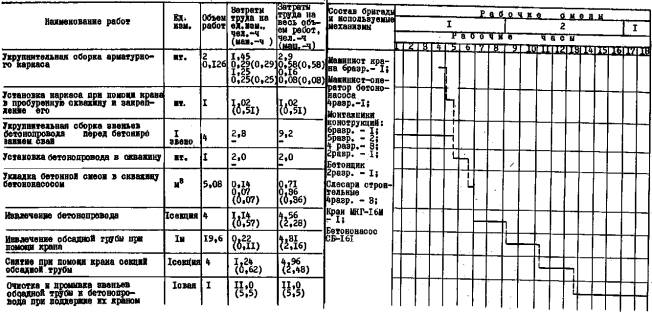 И БЕТОНИРОВАНИЕ БУРОНАБИВНЫХ СВАЙ. ТЕХНОЛОГИЧЕСКАЯ КАРТА Москва 1988 Рекомендовано к изданию решением Научно-технического совета ЦНИИОМТП Госстроя СССР. В технологической карте предложен прогрессивный метод бетонирования буронабивных свай посредством непрерывного нагнетания бетонной смеси с помощью бетононасосов на всю глубину скважины. Технологическая карта разработана отделом бетонных работ ЦНИИОМТП (ответственный исполнитель - В.П. Чураков, исполнители - к.т.н. Б.В. Жадановский, к.т.н. Е.П. Мазов, к.т.н. Ю.Б. Чирков). По всем вопросам, касающимся данной технологии, следует обращаться в указанный отдел ЦНИИОМГП (127434, Москва, Дмитровское шоссе, 9, телефон 216-22-03). Работа предназначена для инженерно-технических работников проектных и строительных организаций. Настоящая технологическая карта разработана на бетонирование свай напорным методом. При использовании забивных свай необходимость удаления оголовков вызывает большие потери железобетона, составляющие примерно пятую часть всего объема забивных свай. Применение набивных свай позволяет не только избежать потерь, но и повышает надежность фундаментов, особенно при устройстве их в сложных инженерно-геологических и гидрогеологических условиях. Для существующих методов бетонирования набивных свай характерны такие недостатки, как прерывистость технологического цикла, "разбавление" бетонной смеси водой или глинистым раствором и ее расслоение в результате этого, большие затраты ручного труда. Разработанный ЦНИИОМТП Госстроя СССР напорный способ бетонирования набивных свай позволяет устранить указанные недостатки и обеспечить комплексную механизацию технологических процессов. Сущность напорного метода бетонирования заключается в непрерывном нагнетании бетонной смеси на всю глубину скважины с помощью бетононасосных установок (бетононасосов), при этом используются цельные обсадные трубы. Содержание 1. ОБЛАСТЬ ПРИМЕНЕНИЯ1.1. Технологическая карта разработана на бетонирование буронабивных свай с использованием бетононасосов, применяемых для укладки литых бетонных смесей. 1.2. В качестве объекта-представителя принят производственный корпус института "Молдгипроводхоз". 1.3. В состав работ, рассматриваемых картой, входят: армирование буронабивных свай; заполнение полостей скважин бетонной смесью; устройство оголовков свай. 1.4. Привязка технологической карты к конкретному объекту и условиям строительства уточняет объемы работ, калькуляцию затрат труда, применяемые средства механизации (с учетом максимального использования наличного парка механизмов и приспособлений). 2. ОРГАНИЗАЦИЯ И ТЕХНОЛОГИЯ СТРОИТЕЛЬНОГО ПРОЦЕССА2.1. До начала устройства буронабивных свай должны быть выполнены следующие работы: - планировка площадки строительства; - устройство временных или постоянных подъездных дорог к объекту строительства; - установка временного ограждения строительной площадки, а также предупредительных и указательных надписей и знаков безопасности; - закончено бурение скважин; - смонтированы и опробованы машины, механизмы и приспособления, необходимые для производства работ; - завезено на строительную площадку и уложено в пределах рабочих зон не менее 30 % арматурных каркасов; - проведен инструктаж рабочих по технике безопасности. 2.2. Заполнение скважины бетонной сме
