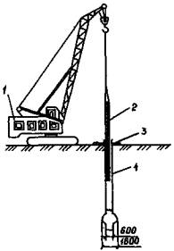 с помощью крана приподнимают на 0,3- К бетонированию следует приступать при наличии готовой бетонной смеси на полный геометрический объем набивной сваи с учетом необходимости бетонирования также ее оголовка. При установке режима нагнетания динамическое давление не должно превышать 0,9 от максимального, развиваемого бетононасосом. При повышении давления вертикальный участок бетонопровода краном поднимают на высоту, меньшую или равную ходу горизонтального компенсатора (без прекращения подачи смеси), при этом вертикальный участок должен оставаться заглубленным в бетонной смеси не менее чем на При укладке бетонной смеси до поверхности скважины верхний слой смеси с примесью бурового шлама удаляют, затем устанавливают инвентарную опалубку для формования оголовка сваи, после чего извлекают бетонопровод из скважины. При этом продолжают нагнетать бетонную смесь с минимальной скоростью. По окончании бетонирования сваи и извлечения бетонопровода из скважины сразу же приступают к извлечению обсадной трубы и последующему формованию оголовка набивной сваи. В это время вертикальный участок бетонопровода устанавливают в очередную скважину, подготовленную для бетонирования. Для извлечения обсадных труб грузоподъемные краны оборудуют приборами ограничения грузоподъемности. С целью полного исключения возможности