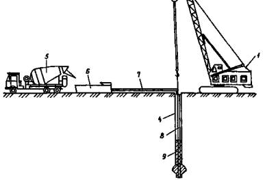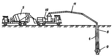 1 - гусеничный кран МКГ-16М; 2 - арматурный каркас; 3 - труба-кондуктор; 4 - обсадная труба; 5 - автобетоносмеситель; 6 - бетононасос; 7, 8 - верхний и нижний участки бетонопровода; 9 - уложенный бетон, 10 - автобетононасос; 11 - распределительная стрела автобетононасоса Приложение
