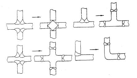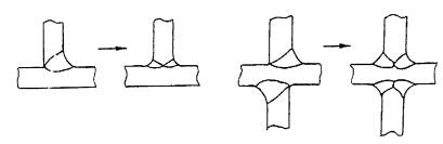 Рисунок 5.4 - Применение симметричных угловых швов 5.4 При конструировании угловых, тавровых и крестообразных соединений целесообразно применять вставки из профилей со специальной формой поперечного сечения, присоединяемые к листам только стыковыми швами (рисунок 5.5). Для таких вставок, в частности, могут быть использованы стальные профили, изготовленные методом горячего прессования по ТУ 14-1-3602-81. Преимуществом этой металлопродукции является возможность получения профилей малыми (по массе) партиями, а также большое разнообразие возможных форм и размеров их поперечного сечения.