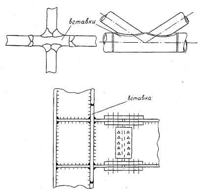 Рисунок 5.5 - Использование вставок из профилей специальной формы 5.5 Для снижения жесткости сварных соединений следует стремиться к уменьшению толщины соединяемых листов. Это возможно только в пределах, обусловленных расчетом на прочность элементов конструкций. Уменьшение толщины в ряде случаев позволяет также снизить объем наплавленного металла. 5.6 Сопротивление слоистому разрушению соединений и узлов может быть значительно повышено применением вставок из листового проката с гарантированными механическими свойствами в направлении толщины и гарантированным ограничением нарушений сплошности (рисунок 5.6). Дополнительные требования к материалу вставок должны соответствовать нормам, приведенным в разделе 4 настоящего стандарта.