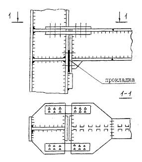 Рисунок В.3 - Болтовое соединение ригеля с колонной с вертикальными накладками, пропущенными в прорези полки колонны и торцевой планки ригеля